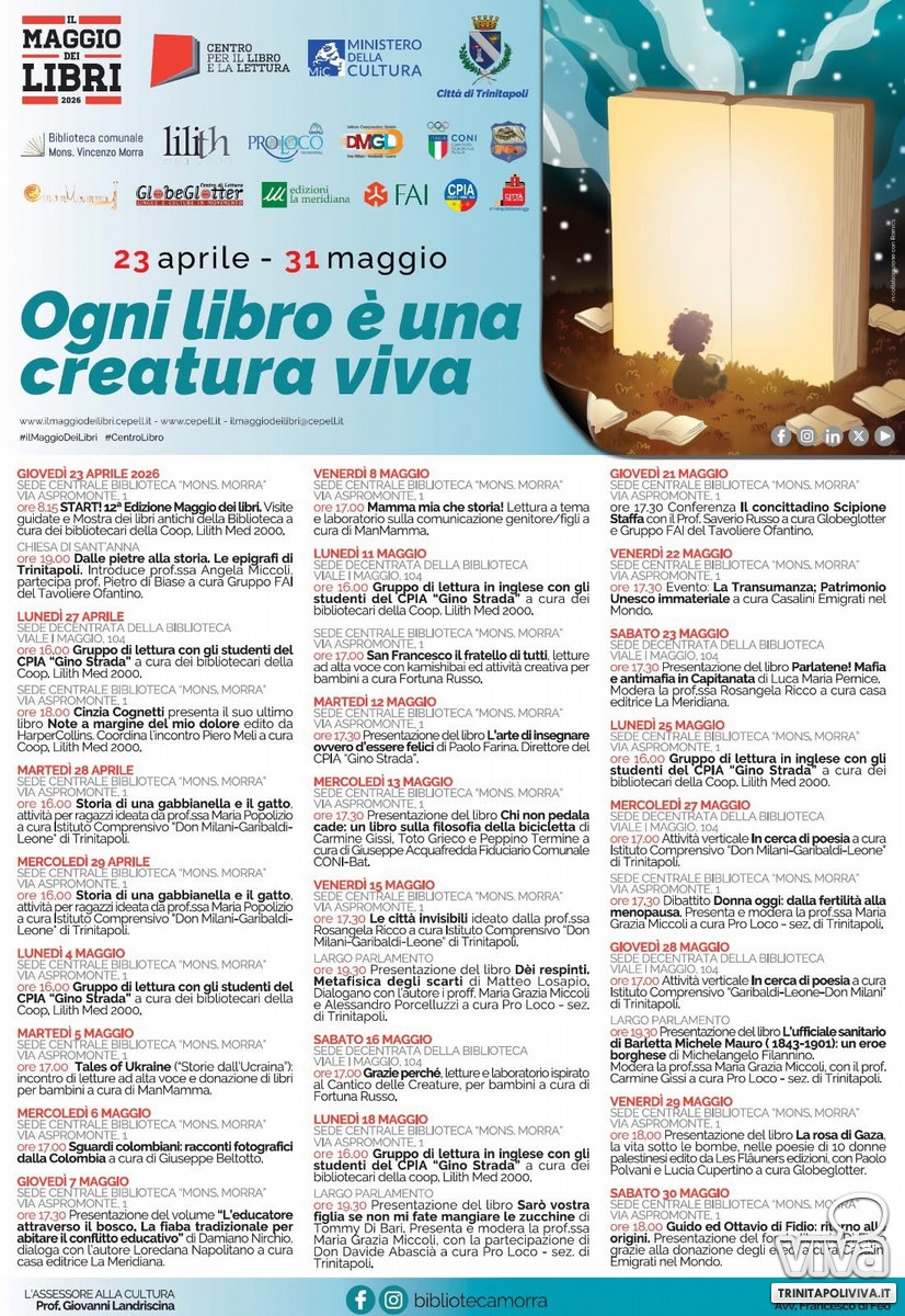 In occasione della Giornata Mondiale del Libro e del Diritto d'Autore, celebrata oggi su impulso dell'Unesco, l'Amministrazione comunale di Trinitapoli presenta ufficialmente il programma del "Maggio dei Libri", una rassegna di iniziative dedicate alla promozione della lettura e della cultura.