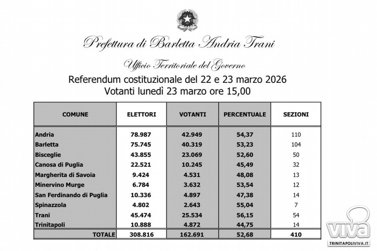 Secondo la rilevazione, nella BAT si è recato alle urne il 52,68%.
