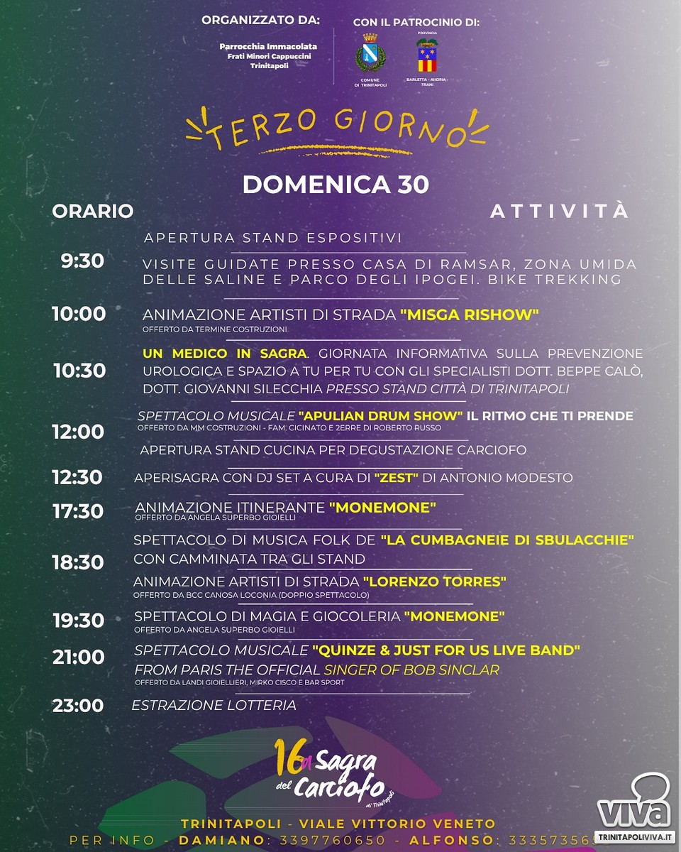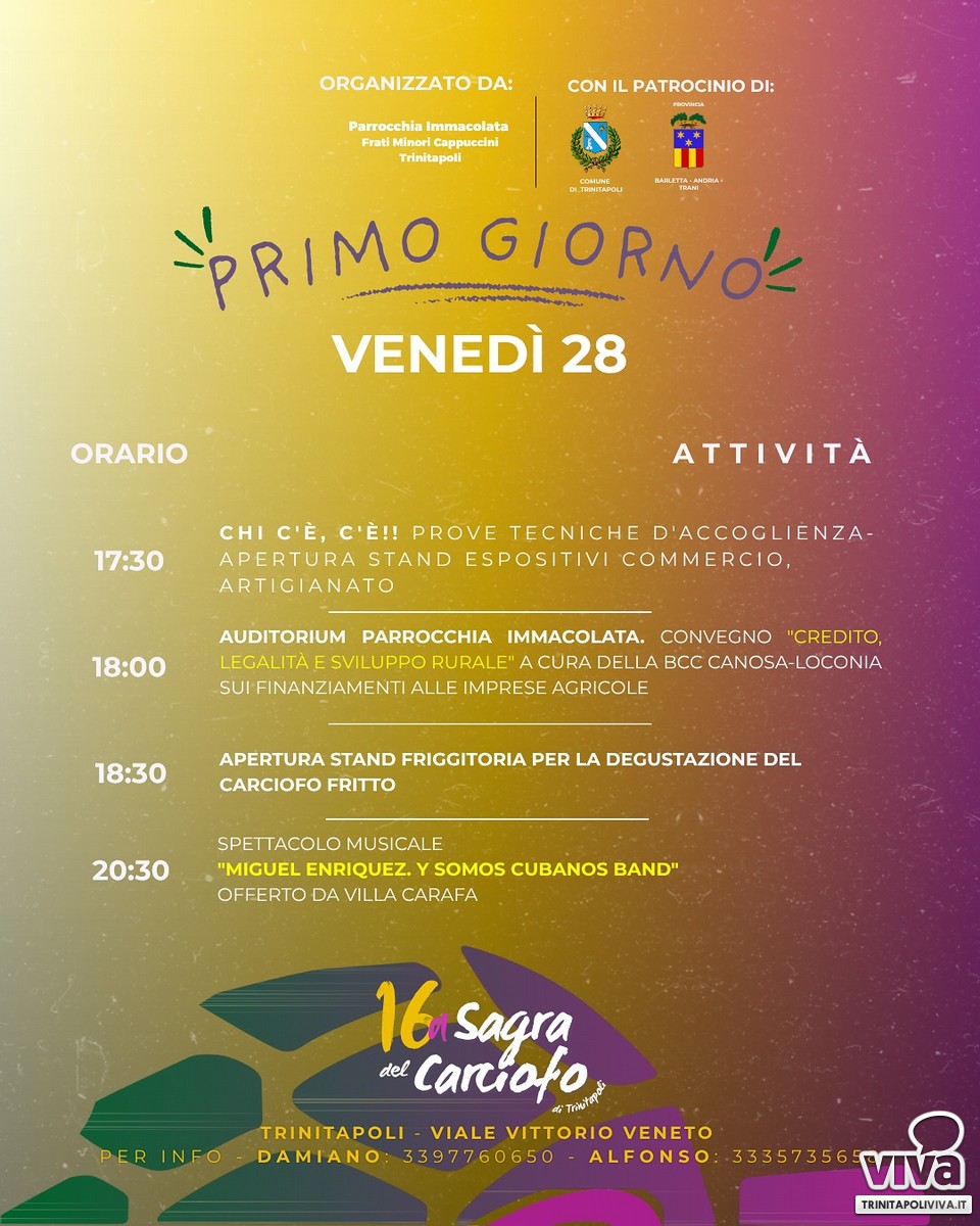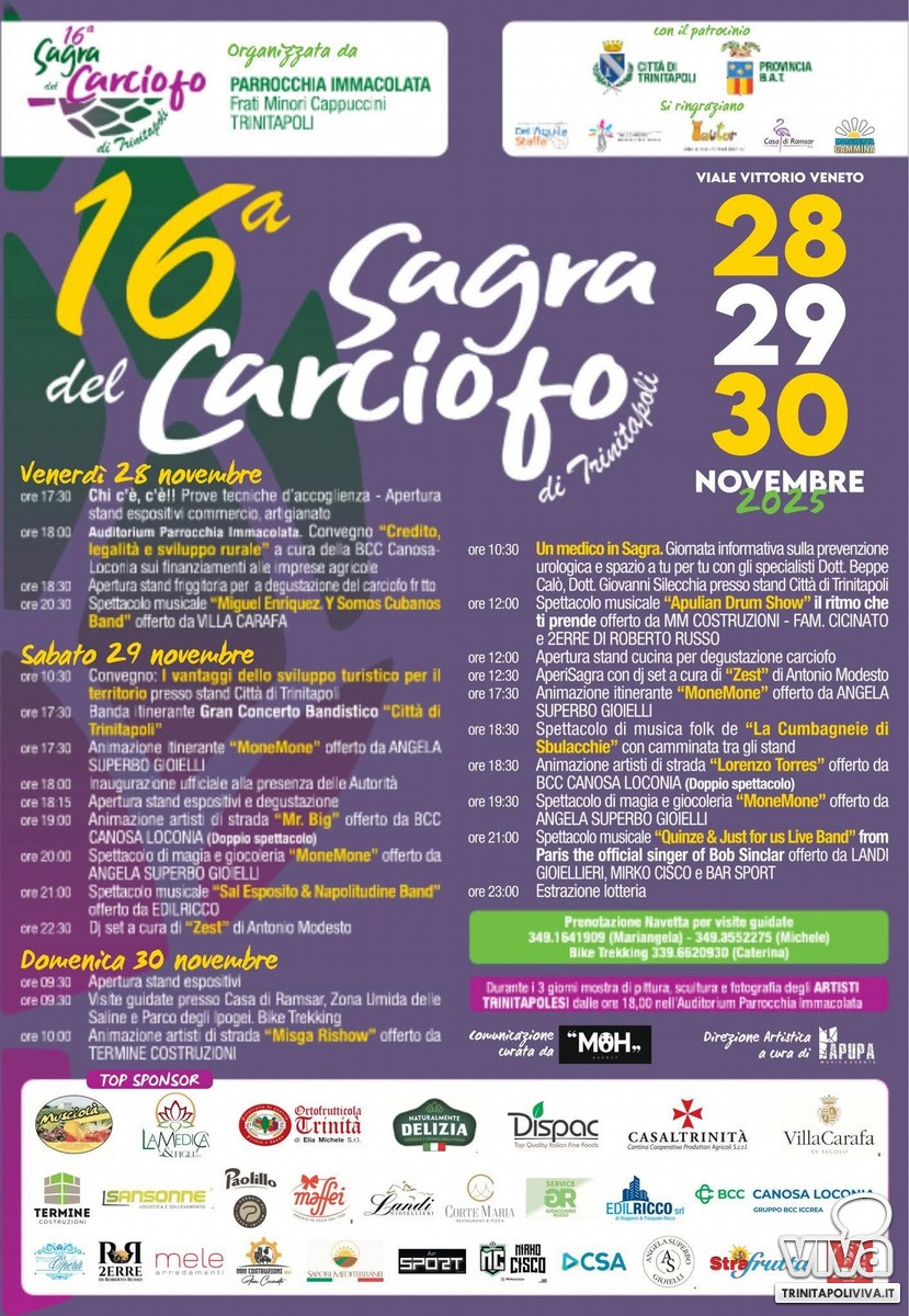 La Parrocchia Immacolata dei Frati Minori Cappuccini ed il Comune di Trinitapoli annunciano con orgoglio la 16ª edizione della Sagra del Carciofo di Trinitapoli, storica manifestazione dedicata al prodotto simbolo del territorio: il prestigioso Carciofo Violetto di Trinitapoli.